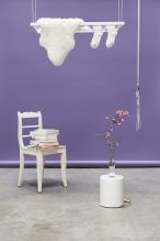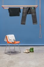 Erscheinungsbild für einen Wäschehänger mit einem spielerisch dynamischen Logo (höhenverstellbar), das die Funktionsweise des Produkts interpretiert. Produktfotografie, Geschäftsausstattung mit Broschüre und Visitenkarte.